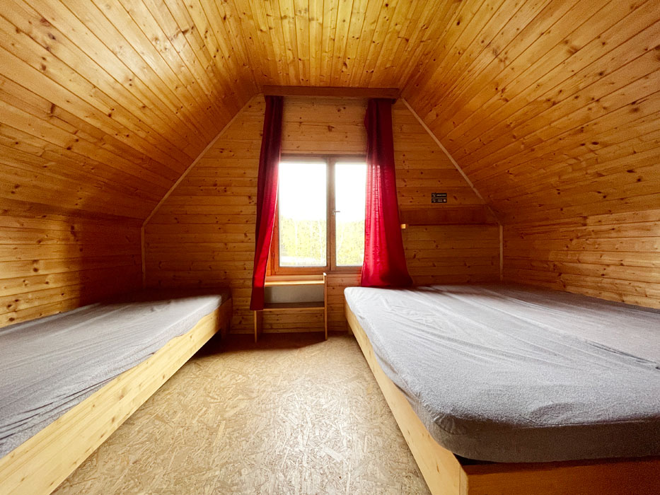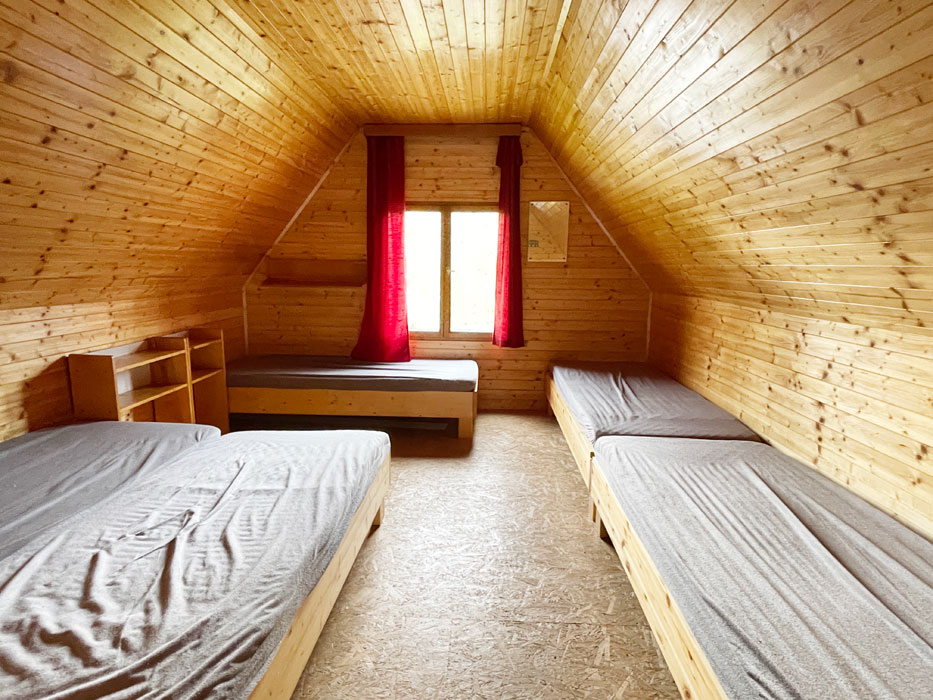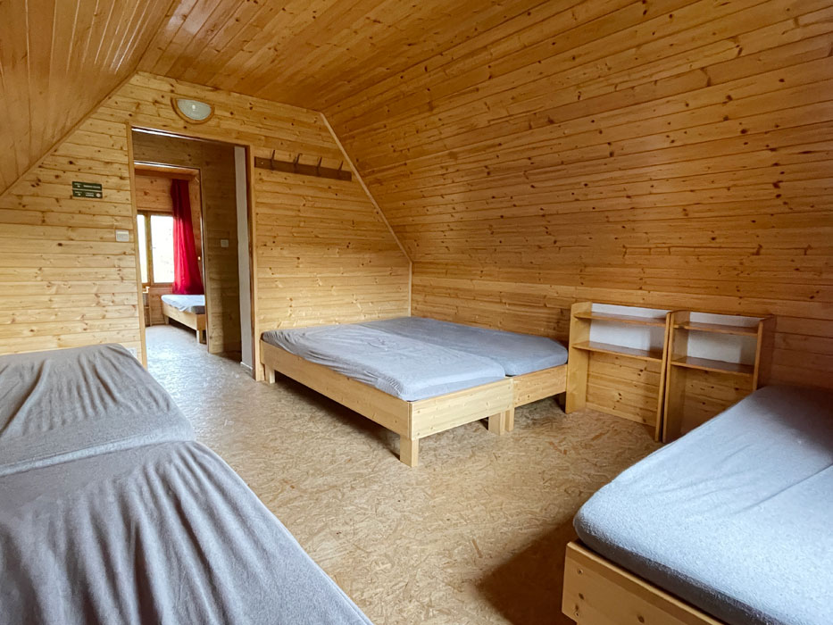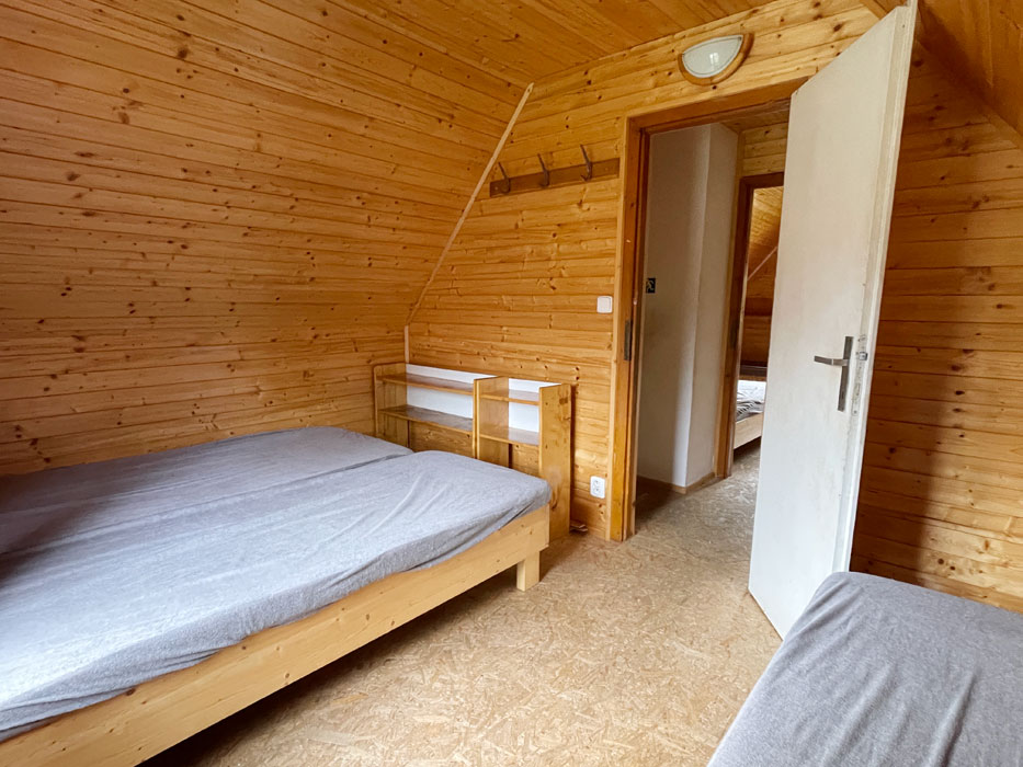 V přízemí chaty se nachází kuchyň, WC a společenská místnost s krbem. V patře jsou dva pokoje – třílůžkový a pětilůžkový, takže chata je vhodná jak pro rodiny s dětmi, tak pro menší skupiny přátel.